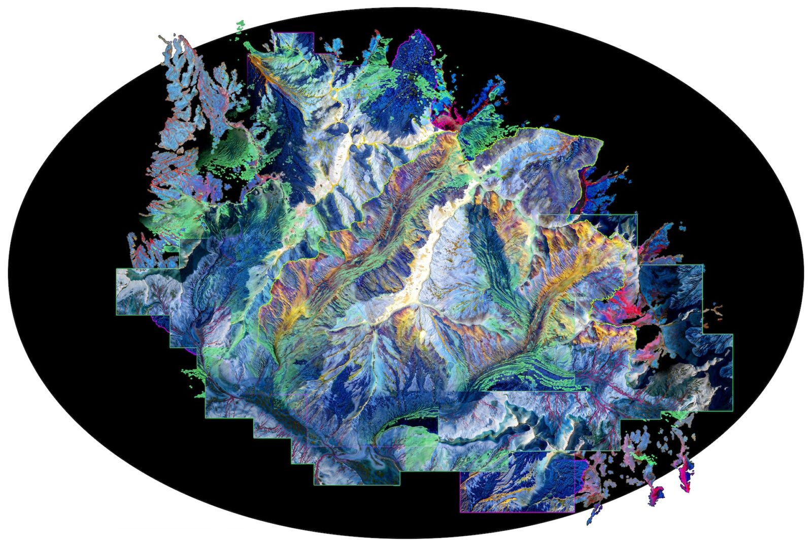 Née d’une collaboration entre le travail textile d’Alexandra Mocanu et le studio de création RETINAA, Relief est une œuvre prend la forme d’une broderie de grand format. Puisant son inspiration dans les collections de la BnF, l’œuvre représente un fragment du Massif du Mont Blanc. Modélisé en 3D à partir de géodonnées de l’Office fédéral de topographie de la Suisse, cette représentation à la croisée du dessin cartographique traditionnel et de l’imagerie satellitaire moderne, évoque autant un paysage naturel qu’un territoire abstrait. À cette broderie vient s’ajouter une impression visible uniquement sous UV, réalisée avec une encre de sécurité.