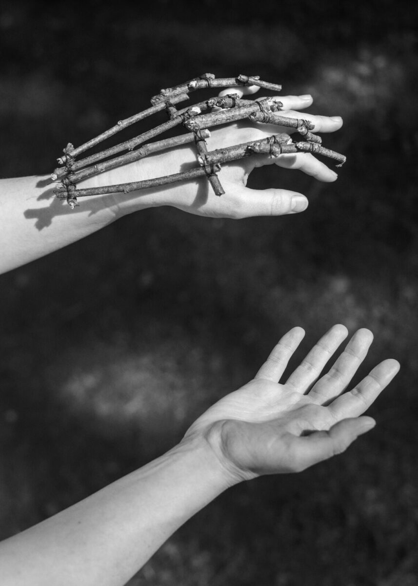 Les « non technological devices » sont des outils composites façonnés à partir d’éléments naturels glanés, assemblés pour imiter les dispositifs technologiques de notre quotidien. Entre bricolages rudimentaires et créations de science-fiction, ces artefacts apparaissent à la fois comme des prolongations du corps, des objets de soin et des symboles ambigus d’un futur à réinventer. Ensemble, ils composent un univers fictionnel qui reflète nos fantasmes du progrès.